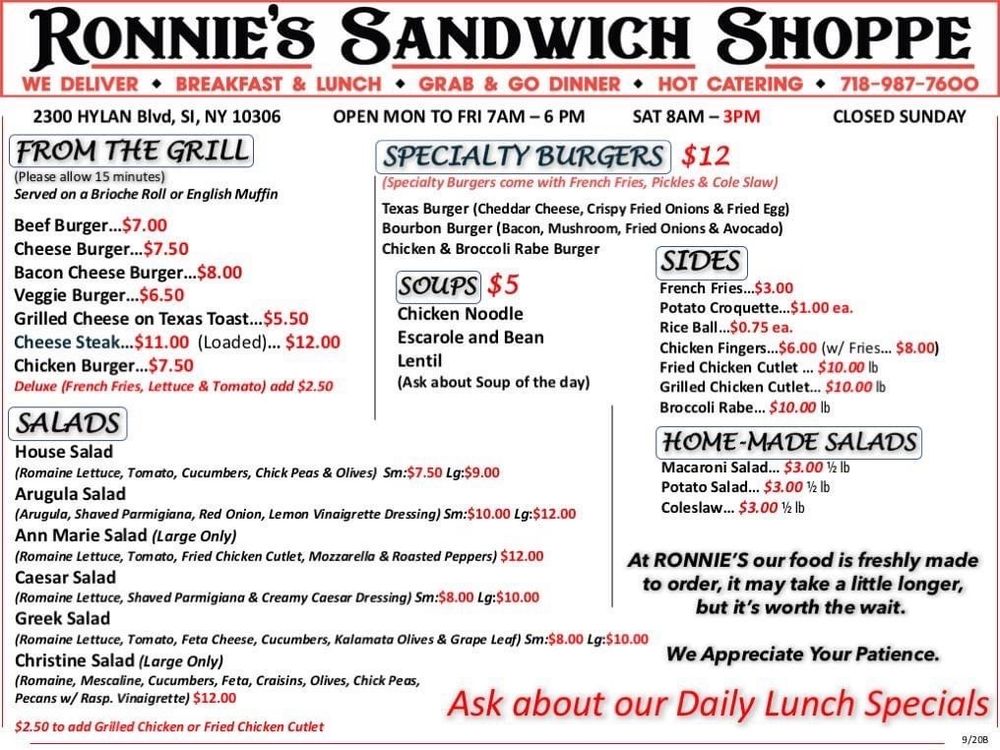Ronnie's Sandwich Shoppe Menu (2025 Update)