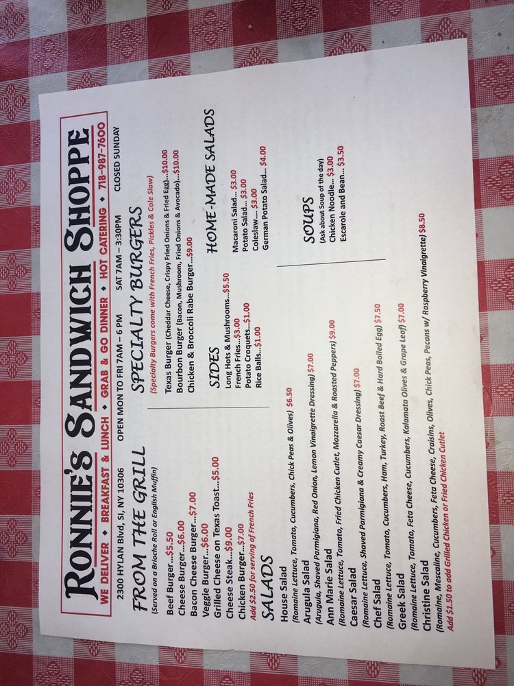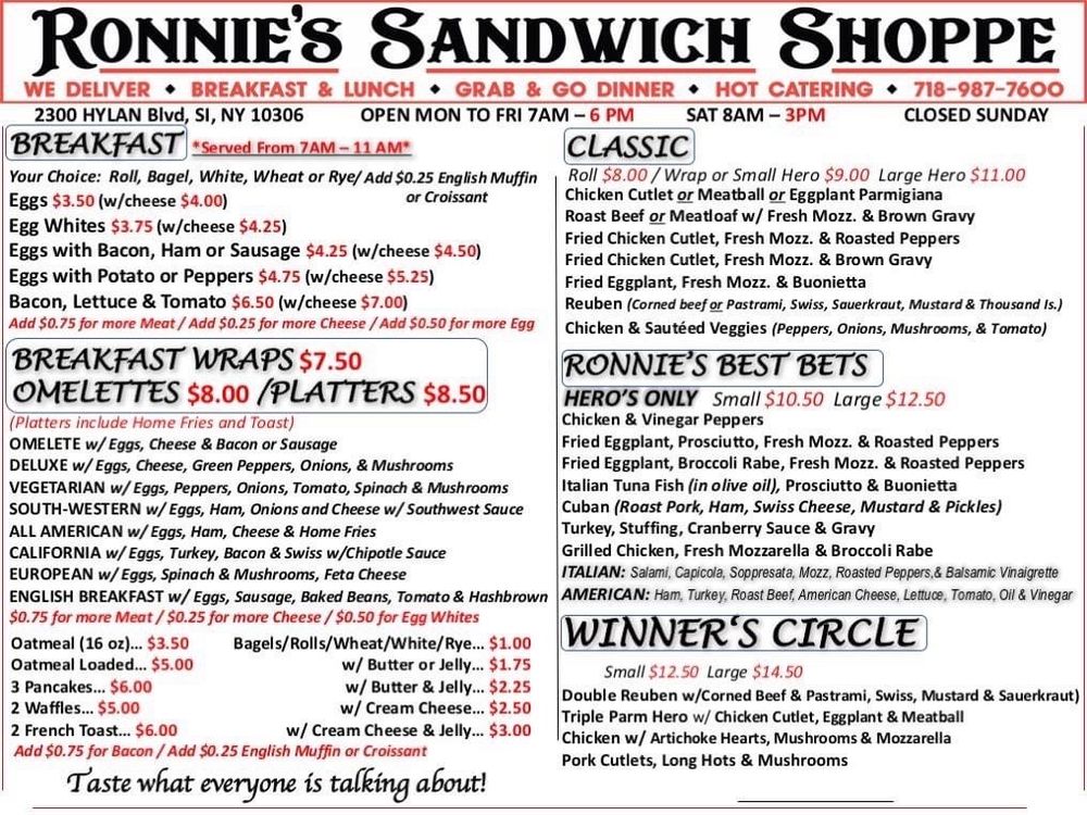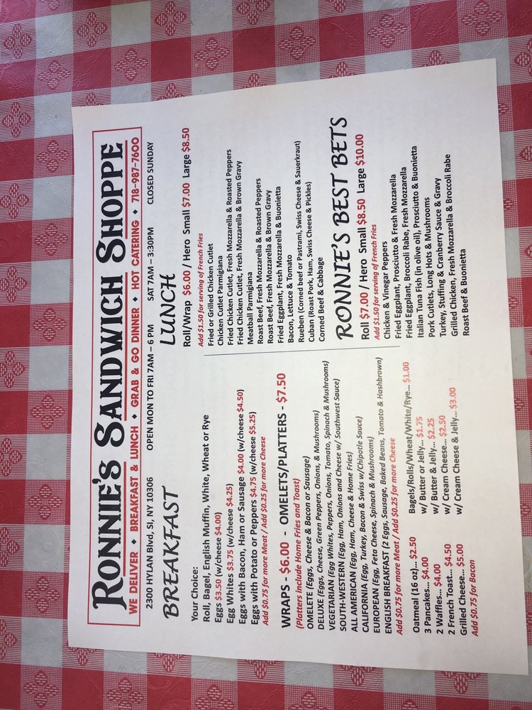 Introducing the menu at Ronnie's Sandwich Shoppe, a beloved spot in Staten Island offering a variety of breakfast and sandwich options. The breakfast menu includes classic choices like eggs, bacon, and toast, as well as more indulgent options like loaded oatmeal and fluffy pancakes. For those craving a heartier meal, omelette platters with various fillings are available. Customers rave about the delicious sandwiches, with highlights including the chicken cutlet hero with mozzarella and roasted peppers, and the eggplant parm sandwich. The friendly staff and reasonable prices make Ronnie's a must-visit for both locals and visitors. Don't miss out on the mouthwatering sandwiches and generous portions offered at Ronnie's Sandwich Shoppe.